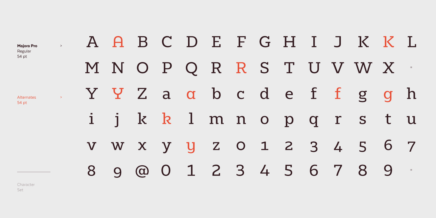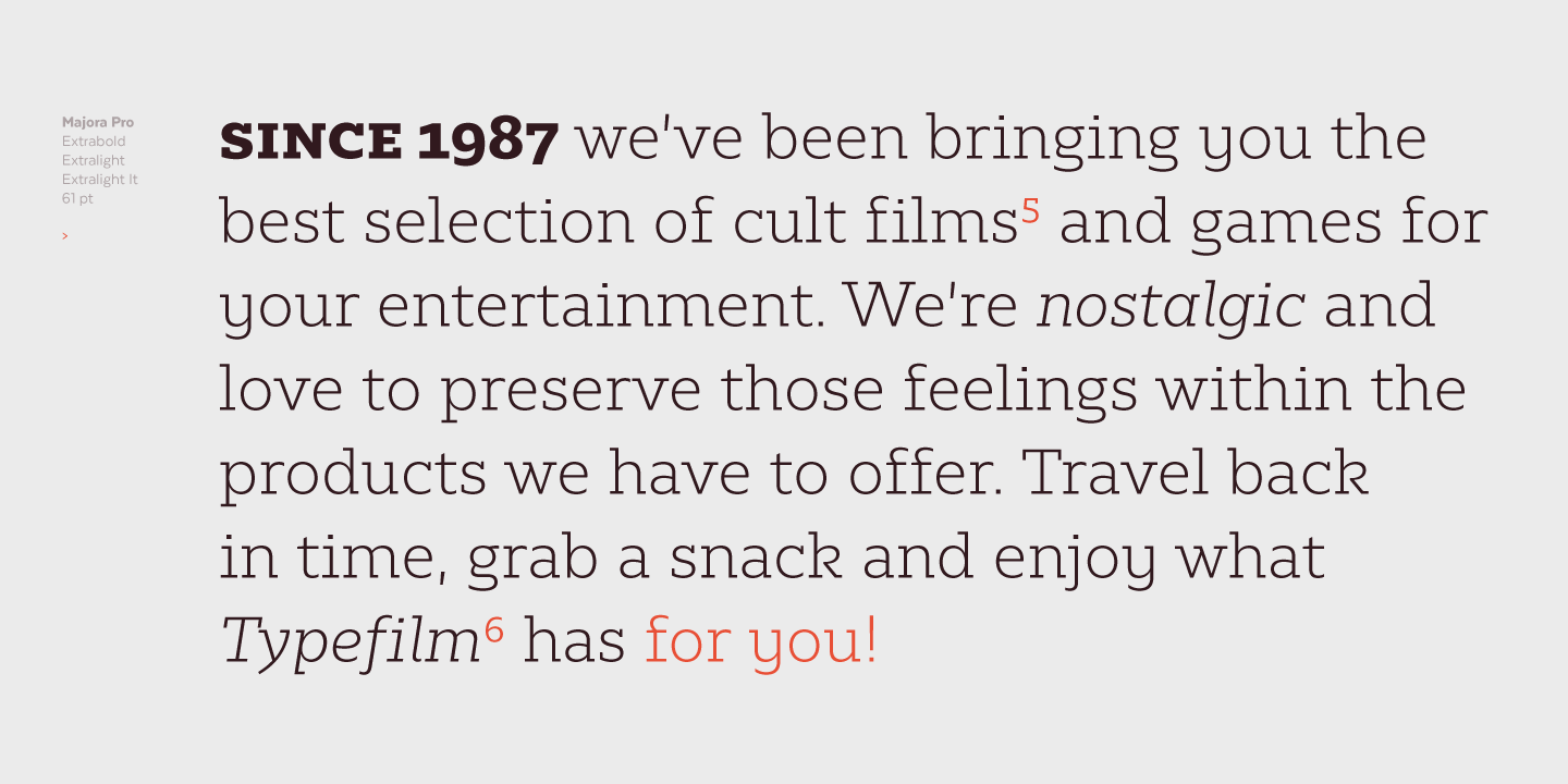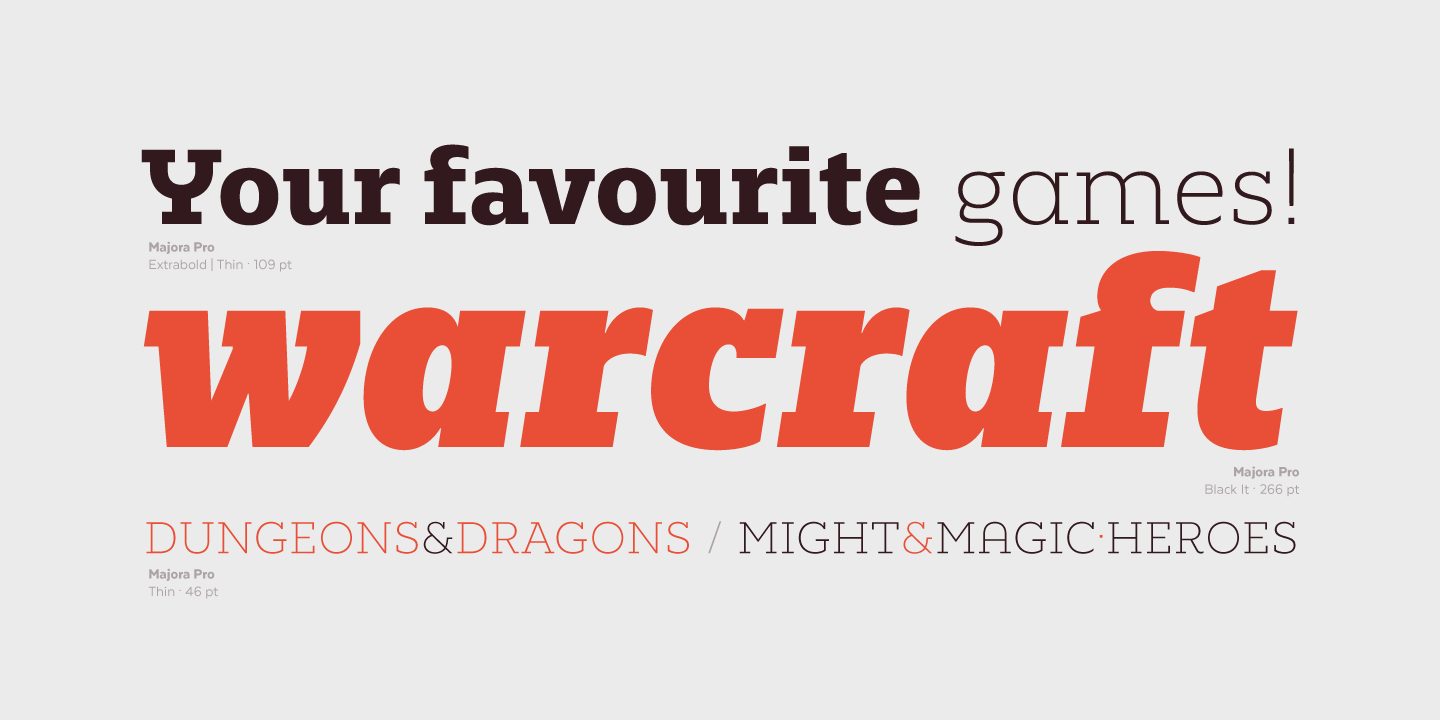 Majora Pro is a slab serif typeface which derives its name from a Portuguese historical toy manufacturer. The font comes in 8 styles, ranging from a delicate Thin to a robust Black, with matching italics and an upright version of stencil fonts, resulting in a total of 24 weights. Majora Pro is well-suited to a wide range of design projects which include packaging, editorial design, screen use, etc. Its humanistic features and moderate contrast between thick and thin strokes make it also suitable for long block of texts while having a high degree of legibility. The font includes a set of alternate glyphs which help give your compositions a different and unique look. The Stencil version was specially designed for use in signage, packaging, titles and headings. Majora Pro contains an extensive set of 750 characters (including small caps, different figure styles, etc.) that support over 200 Latin-based languages.